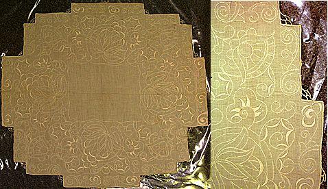 Pienehkö neliömäinen liina, jonka kulmat lovetut portaittaisesti; reunoilla leveänä vyöhykkeenä ommeltu kukka-aiheinen kirjonta; reunus viimeistelty napinläpipistoin, joista myös ommeltu sisäkulmiin silmukat