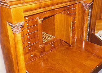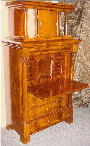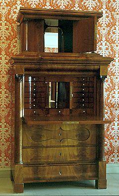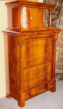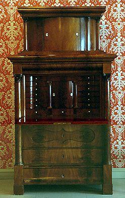 Suurikokoinen kaappilipasto, jossa on lipastomainen alaosa laskulevyineen. Laskulevyn takana vetolaatikoita ja pieni kaappi, jota kehystää sivuilla pienet korinttilaiset pylväät. Myös kaappilipaston sivuilla korinttilaiset pylväät. Jalkoina matalat neliömäiset puupalat. Lipasto-osan yläreuna profiloitu. Kaappilipaston yläosa kaareva, sitä kannattaa korinttilaiset pylväät, yläreuna profiloitu.