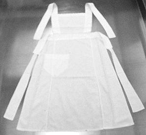 Valkoista tiivistä puuvillakangasta. Helma kolmesta alaspäin levenevästä kaitaleesta.Edestakaissaumat, reunassa kapeat konepäärmeet ja helmassa kapea konepäärme. Leveä vyötärökaitale, jonka päissä solmiamisnauhat. Paikkatasku, jossa alareuna v-mallinen