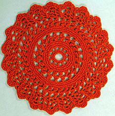 Pieni pyöreä virkattu liina, jossa erilaisin silmukoin suureneva kaarevareunainen ympyrä.