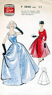 Kaavat: Naisen iltapuvun kaavat,koko 44. Mallipiirros: Naisen iltapuvun mallipiirros.Olkaimet,tiukka vyötärö,leveä helma.Vierailupuku,lyhythihainen. Leikkuu- ja ompeluohjeet: Naisen iltapuvun leikkuu- ja ompeluohjeet.