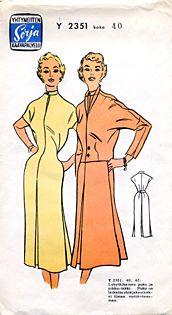 Kaavat: Naisen puvun ja jakun kaavat,koko 40. Mallipiirros: Naisen puvun ja jakun mallipiirros.Kapealinjainen puku,korkea kaulus,kimonohiha.Jakussa pitkät kimonohihat,edessä napitus,shaalikaulus,kapea.Puvussa edessä ja takana vastalaskokset. Leikku -ja ompeluohjeet: Naisen puvun ja jakun leikkuu -ja ompeluohjeet.