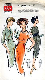 Kaavat: Naisen puvun kaavat,koko 38. Mallipiirros: Naisen pukujen mallipiirros.Puku lyhythihainen,rinnan alapuolella sauma.Vyötäröllä sauma,laskokset.Puku pohjepituisena ja polven alapuolelle.Vyötäröpituinen jakku. Leikkuu -ja ompeluohjeet: Naisen pukujen leikkuu -ja ompeluohjeet.