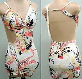 Selästä ja kyljistä avonainen uimapuku, jossa ylä- ja alaosaa yhdistää keskellä edessä kapea kaitale. Housuosa on korkea, vyötärölle ulottuva. Rintaliiviosassa keskellä edessä poimutusta. Olkaimet muodostuvat tuppilosta, joka lähtee oikealta edestä jatkuen taakse yläosan lenkkienläpi vasemmalle eteen solmittavaksi renkaaseen.
