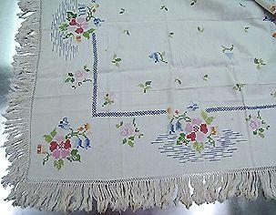 Neliön muotoinen, hapsullinen liina, jossa keskellä sauma. Kulmissa ja sivuissa isohkot kukkaryhmät, keskellä pieniä yksittäisiä kukkia ja lehtiä.