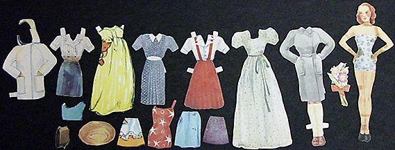 Paperinukke: kapeauumainen paperinukke. Kädet lanteilla. Vaatteet, 15 kpl: paperinuken vaatteita.