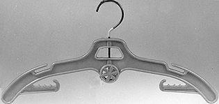 Kovasta muovista tehty, kaartuva vaateripustin. Ohut, reunat paksut ja pyöristetyt. Ripustuskoukku kääntyvä.