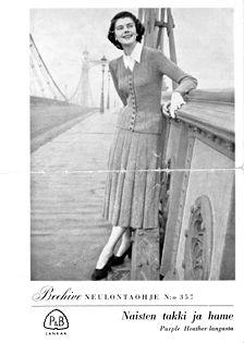 Taitettu arkki, jossa on naisten takin ja hameen neulontaohje.