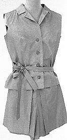Pusero: lantiopituinen suora hihaton pusero, jossa takana ylhäältä ja alhaalta tikattu vastavekki. Pienehkö herrainmallinen kaulus, edessä napitus. Irrallinen solmittava vyö. Housuhame: lyhyt housuhame, jossa housuosa sekä edessä että takana leveän vastalaskoksen alla. Vyötäröllä sisäänotot, vyötärönauha ja sivusaumassa vetoketju.