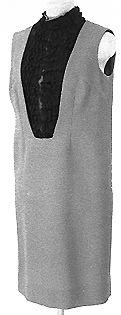Polvipituinen suora hihaton kotelomekko. Irrallinen vyötäröön asti ulottuva pystykauluksellinen neppareilla kiinnitettävä edusta, jossa puvun kankaalle pystysuunnassa poimutettu pitsi. Kauluksessa pitsi vaakasuunnassa.