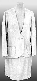Jakku: lantiolle ulottuva suora jakku. Keskitakasauma. Istutetut suorat pitkät hihat. Kaulukseton, pääntie takaa pyöreä, edestä vyötärölle saakka uurrettu. Vyötäröllä nappipari. Paikkataskut. Etureuna helmasta pyöristetty. Hame: polvipituinen suora hame. Lantiolla muotoleikkaukset. Sivusaumassa vetoketju, vyötärönauha, ripustuslenkit.