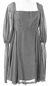 Polvipituinen vyötärösaumallinen puku, jossa kapean vuoritetun helmaosan päällä kellomainen sivuista avoin päällikangas. Pääntie hyvin avara, neliönmuotoinen. Yläosa istuva, vuoritettu, olkain jää hihan alle. Löysä hiha poimutettu kyynärpään kohdalta alkavaan kapeaan pitkään hihaan. Sivusaumasssa vetoketju.