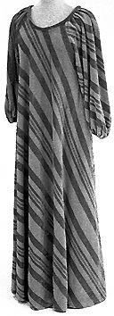 Vyötärösaumaton, leveähelmainen, vinosti leikattu puku. Leveät, pitkät raglamalliset, pääntieltä poimutetut hihat, hihansuissa kuminauhat. Pääntie pyöreä ja avara, kantattu.