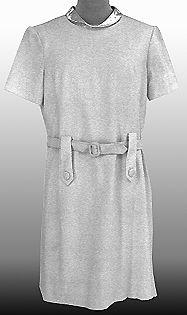 Polvipituinen vyötärösaumaton puku. Istutetut suorat lyhyet hihat. Pääntie pyöreä, siinä hopeanvärinen pystykaulus. Keskitakasaumassa pitkä vetoketju. Lantion kohdalla vyö, edessä isot tamppimaiset vyölenkit, niissä päällystetty nappi. Vyön solki päällystetty.
