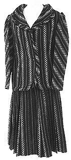 Jakku: lyhyt istuva jakku. Vinoonleikatut ylhäältä rypytetyt pitkät suorat alhaalta kapeat hihat. Kaulukseton, liepeet käännetyt. Pääntietä, etureunaa ja helmaa kiertää vinoonleikattu poimutelma. Edessä vyötäröllä yksi koristenappi, ommeltu näpinläpi. Hame: pohjepituinen laskostettu hame. Leveä vyötärönauha. Sivulla vetoketju ja nepparit.