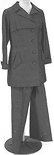 Jakku: lantiolle ulottuva jakku, jossa takasaumassa halkio. Istutetut pitkät hihat, hihansuissa päälletaitetut mansetit. Suorakulmainen laakamallinen herrainkaulus. Edessä rinnan korkeudella poikittainen koristelaskos. Neljä päällystettyä nappia, kantatut napinlävet. Vinot upotetut taskut, koristeläpät. Housut: lahkeesta loivasti levenevät vuorilliset housut. Vyötäröllä sisäänotot, vyötärönauha, ripustuslenkit, sivusaumassa vetoketju ja haka.