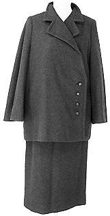 Takki: vyötärösaumaton helmasta levenevä takki. Takana laskos. Alhaalta leveät istutetut suorat hihat. Herrainkaulus, ylemmät liepeet ja takaa kapea. Toispuoleinen kiinnitys neljällä napilla, kantatut napinlävet. Hame: polvipituinen suora istuva hame. Vyötäröllä sisäänotot.Takana vetoketju ja haka. Takasaumassa halkio.