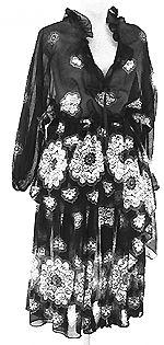 Pusero: kimonohihainen lantiopituinen löysä pusero. Hihansuissa kuminauha. Pääntie V-mallinen, sitä reunustaa edestä solmittava ohut silkkinauha ja pienehkö poimutus. Hame: pohjepituinen vyötäröltä runsaasti poimutettu kietaisuhame. Leveä vyötärönauha, kiinnitys neppareilla ja hakasella. Erillinen, päistään leveä, solmittava vyö.