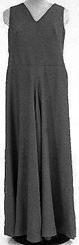 Vyötärösaumallinen kokohaalari. Yläosa vartalonmukainen, hihaton, pääntie avara V-malli, keskitakasaumassa pitkä vetoketju. Kangas kaksinkertainen. Lahkeissa alalahje suora, päällimmäinen leveä.