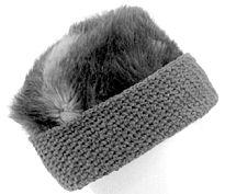 Suora- ja korkeahkoreunainen tekoturkishattu, jonka tasainen päälliosa on ommeltu kolmionmuotoisista paloista. Alareunaan kiinnitetty turkiksen päälle käännettävä panta peittää kolmeneljäsosaa reunasta.