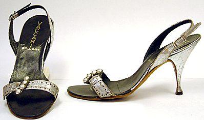 Korkeakorkoiset, kannasta ja kärjestä avonaiset sandaalit, joissa edessä kapea, reunoistaan koristeltu kaarroke ja siinä isohko helmikoristeltu metallisolki. Takaa kantapäätä kiertää kapea, nauhamainen remmi, jossa solki. Korko kapea, ns. piikkikorko. Pohja ohut.