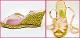 Kiilakorollinen sandaali, jossa korko ja pohja päällystetty kapealla letitetyllä narupunosnauhalla. Kärki avoin, rinnuksessa pohjasta keskieteen lähteviä lehtimäisiä kaitaleita, väleissä tylli. Nilkan kohdalla pitkät, solmittavat nauhat.