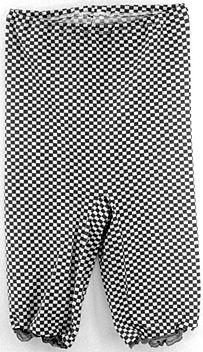 Suorat, kahdesta kappaleesta tehdyt lahkeelliset housut. Sauma keskellä takana ja haarassa. Vyötäröllä kuminauhakuja, lahkeissa pitsimäinen kuminauha.