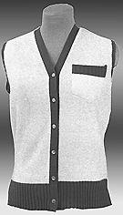 Lantiolle ulottuva liivi,jossa v-mallinen pääntie. Edessä valkoiset pienet napit, vasemmalla puolella rinta-tasku. Taskunsuussa kapeahko, helmassa leveähkö 2x2 joustinneule, muut kanttaukset sileää neuletta.
