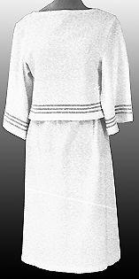 Pusero: vyötäröpituinen suora pusero, jossa helmassa ja hihansuissa koristeraidat. Kimonomallisesti leikatut puolipitkät leveähköt hihat. Venemallinen pääntie. Hihojen istutus käsinommellen korotettu. Hame: pohjepituinen suora kapea hame. Vyötäröllä sisäänotot, vyötärönauha, ripustuslenkit ja takasaumassa vetoketju.