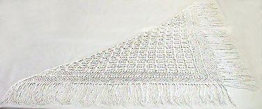 Kolmikulmainen huivi, jossa kahdella sivulla pitkät lankahapsut. Hapsureunoihin on virkattu verkkomainen reunus, muu osa huivia on kukkakuvioitu.