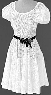 Polvipituinen puku,jossa vartalonmukainen yläosa ja laaja vyötäröltä laskeutuva runsas helma. Pääntie avara, lyhyet pussi-hihat. Lantiolla samettinauhassa ruusuke. Huom ! ei alkuperäinen ruusuke, tämä tehty näyttelyä varten.