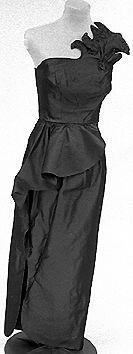 Yläosa: yläosan toiselle olkapäälle kohoaa paljetein kirjottu tyylitelty lehtiaihe. Selkäpuolella kiinnitys hakasilla, sivuilta tuettu Hame: hame heikosti alaspäin kapeneva ns. tulppaanilinjaa. Epäsymmetrinen, toisella sivulla kaarroke. Pukua pidettiin ensiesittelyssään, Porin Ompeluliikkeenharjoittajat ry:n keväisessä muotikatselmuksessa näytöksen tyylikkäimpänä asuna.