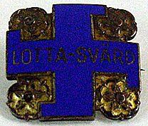 Neliönmuotoinen merkki, jonka keskellä on emaloitu hakaristi ja siinä hopeanvärinen teksti: LOTTA-SVÄRD. Jokaisessa kulmassa, sakaroiden välissä on heraldinen ruusu. Takana neulakiinnitys.