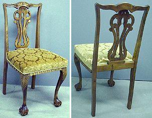 Pikkutuoli, jonka istuin on pehmustettu ja päällystetty kullan värisellä kuviollisella plyysikankaalla. Selusta koristeellinen ja lävistetty. Etujalat kaarevat ja ne päättyvät palloa piteleviin linnun kynsiin. Takajalat koristelemattomat ja suorat.