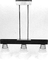Ylhäällä suorakaiteen muotoinen messinkikuppi, josta lähtee kaksi messinkistä ripustusputkea. Ripustusputket päätyvät vaakasuoraan pitkään jalopuiseen runkoon. Rungon alareunaan on kiinnitetty kolme lasikupua. Lasikuvuissa korkeahko messinkikaulus, itse kuvut suorasivuiset, keskikohdassa taite, josta kupu levenee.