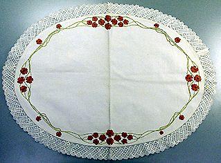 Soikea tarjotinliina, jonka reunaan on kahdella koneompeleella kiinnitetty tehdasvalmisteinen nyplättyä pitsiä jäljittelevä pitsi.