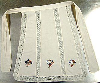 Polven yläpuolelle ulottuva pieni vyötäröesiliina, jossa helma koottu kolmesta osasta upottaen tehdasvalmisteista nyplättyä imitoivaa pitsiä väliin. Helmaa reunustaa kolmesta kapeasta pitsistä yhteenommeltu reunus. Kapeahko vyötärökaitale ja siihen kiinniommellut solmiamisnauhat.