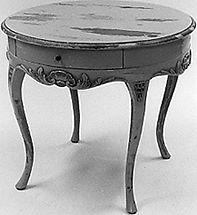 Halkaisijaltaan pyöreä pöytä. Pöytälevy vain hieman runkoa suurempi. Jalat hoikat ja kaarevat, jaloissa kynsikoristelua. Sarja kaareva, sen koristeena edessä, takana ja sivuilla simpukka, jota kehystää kaarevat lehdet. Sarjassa koko pöydän pituinen vetolaatikko, joka voidaan aukaista, joko edestä tai takaa. Vetolaatikon molemmissa päissä pieni metallinen, kukkakoristeinen nuppi.