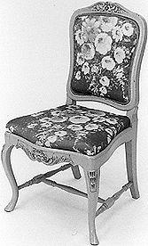 Tuoli: käsinojaton tuoli. Selusta ja istuin verhoiltu. Umpinainen selusta lähes neliönmuotoinen, kaarevareunainen, ylhäällä koristeena pieni kukka ja sitä kehystävät lehdet. Etujalat kaarevat, kynsikoristellut. Takajalat nelikulmaiset, taaksekaartuvat. Etusarja kaareva, sen koristeena simpukka, jota kehystää kaarevat lehdet. Alhaalla sorvattu H-ristikko. Istuin irtonainen, pehmustettu, edestä kaareva. Verhoilukankaat: 1. alkuperäisenä verhoilukankaana sininen, vihreäksi haalistunut tekokuitu?kangas, damastina kudottu huonekalukangas, jossa kukkia ja lehtiä. 2. päällimmäisenä sininen puuvillasatiini, johon painettu vaaleita kookkaita kukkia.