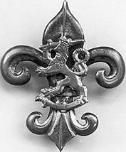 Hopeinen lilja, jonka päälle on kiinnitetty kullan värinen Suomen vaakunaleijona.