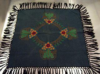 Lähes neliön muotoinen huopapöytäliina, jossa keskellä ympyrä, ja siinä jokaisella sivulla voimakas lehtiaiheinen kuvio.