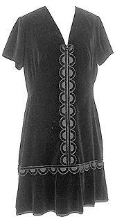 Pohjepituinen, yläosastaan vartalonmyötäinen puku, jonka helmassa kellomainen osa. Lyhyet istutetut suorat hihat. Pääntie takaa pyöreä, siinä vetoketju, edestä V-malli. Keskellä edessä pystysuuntainen koristenauha helmaosaan saakka. Yläosan ja helman saumakohdassa koristenauha, puolikaaren muodot alaspäin.