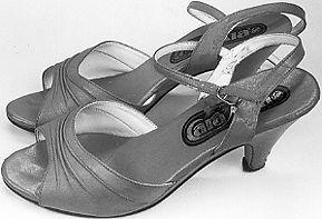 Sirokorolliset sandaalit, joissa kärki ja kanta avoimet. Rinnuksessa kaitale, mikä keskeltä kapeahko, sivuilta leveämpi. Kapea, pienellä soljella säädettävä nilkkaremmi. Remmim liitoskohtiin itseommellut "pehmusteet".