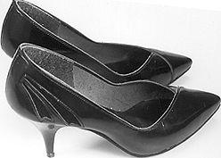 Korkea ja kapeakorkoiset, umpinaiset juhlakengät. Rinnuksesta avara, vinottainen sauma.