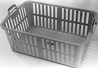 Pohja suorakaiteen muotoinen. Sivut suorat. Sivut ja päädyt puhkonaiset, reiät kahdessa tasossa, muodoltaan pystysuoria palkkeja. Päissä kädensijat.