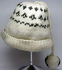Päänmyötäinen myssy, jossa sauma takana. Kaksinkerroin käännetty reuna 1x1 joustinneuletta, muuten sileää ja kirjoneulosta. Reunan taitekohtaan pujotettu kuminauha. Pitkän kierretyn nyörin päässä tupsu.