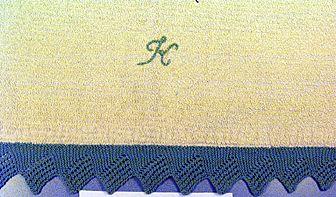 Suorakaiteen muotoinen froteepyyhe, jossa pitkillä sivuilla kapea koneommelpäärme. Lyhyillä sivuilla käänne taitettu koneella ommellulla vinonauhalla. Reunaan käsin ommeltu kudottu pitsi. Pitkillä sivuilla käsin virkatut ripustuslenkit.