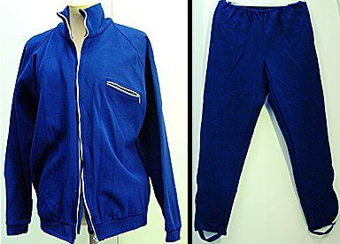Takki: raglahihainen, lantiolle ulottuva verryttelypuvun takki, jossa korkeahko pystykaulus. Edestä avoin, kiinnitys vetoketjulla. Vasemmalla puolen upotettu tasku, jossa vetoketjukiinnitys. Housut: suoralahkeiset miesten verryttelyhousut, joissa lahkeiden suissa sivusaumassa pitkähköt vetoketjut ja jalan alta kulkeva lista. Vyötäröllä kuminauha. Sivusaumoissa upotetut taskut, takana upotettu vetoketjutasku
