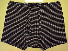 Suoralahkeiset miesten bokserit tekokuituneulosta. Vyötäröllä kuminauhakuja. Keskiedusta kaksinkertainen, aukot vastakkaisissa saumoissa. Takana haarakiila.