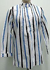Lantiolle ulottuva pitkähihainen pusero, jossa edustassa hiuslaskostus. Pääntie o-mallinen, pystykaulus. Hihansuissa mansetit, nappikiinnitys. Edestä ylhäältä avoin , nappilista ja nappikiinnitys jatkuu kaulukseen.
